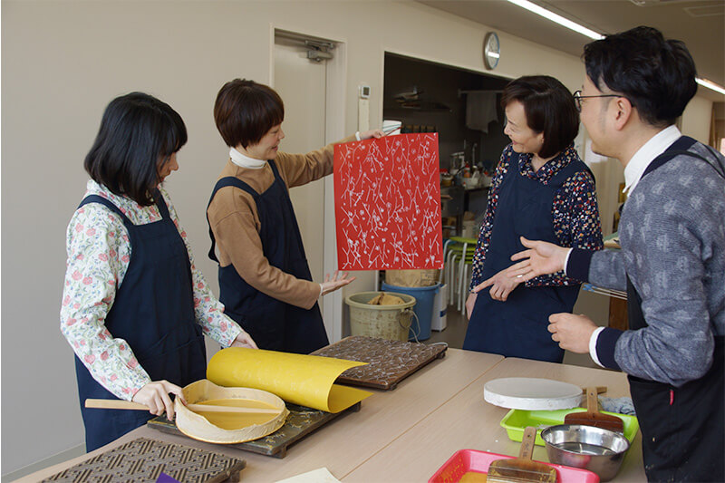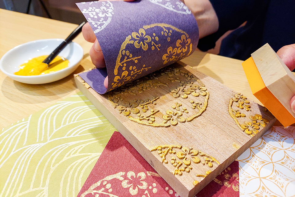 带参观唐纸工坊的体验计划,可近距离感受京都传统工艺。在观看了工匠制作花纹的工序之后,您可以实际体验用木版印刷唐纸花纹。