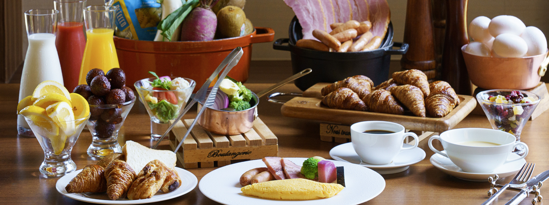 一边沐浴着从地平线升起的清晨阳光,一边享用包含伊豆当地食材的自助餐。