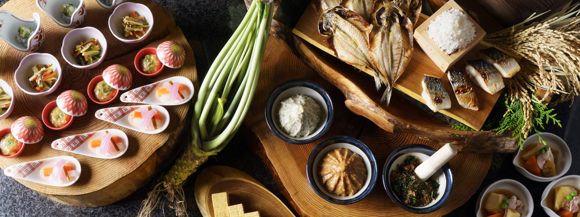 除了使用当地蔬菜、伊豆产的干鱼等制成的配菜和沙拉外,我们的厨师还精心准备了酒店自制的调味料和香松。