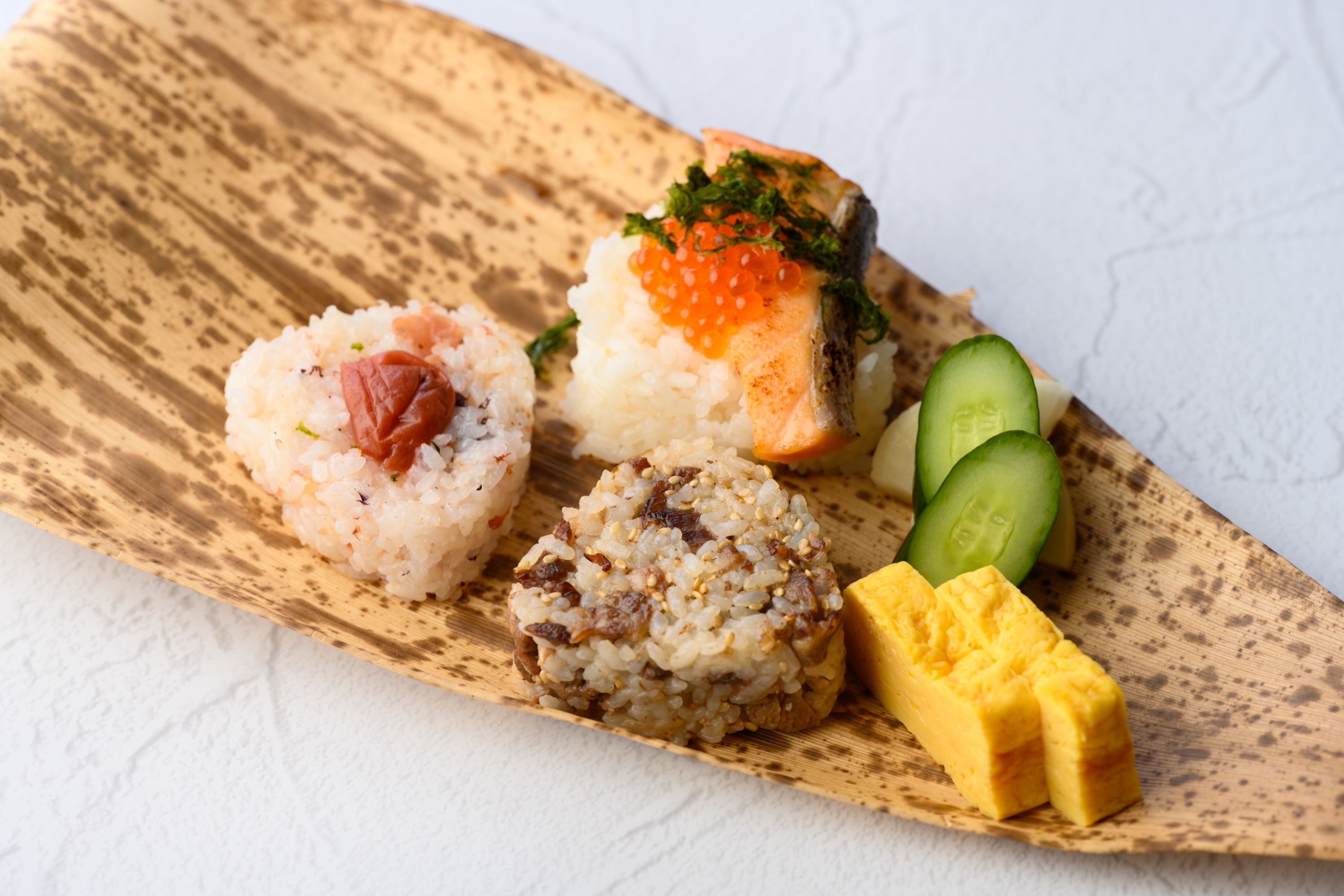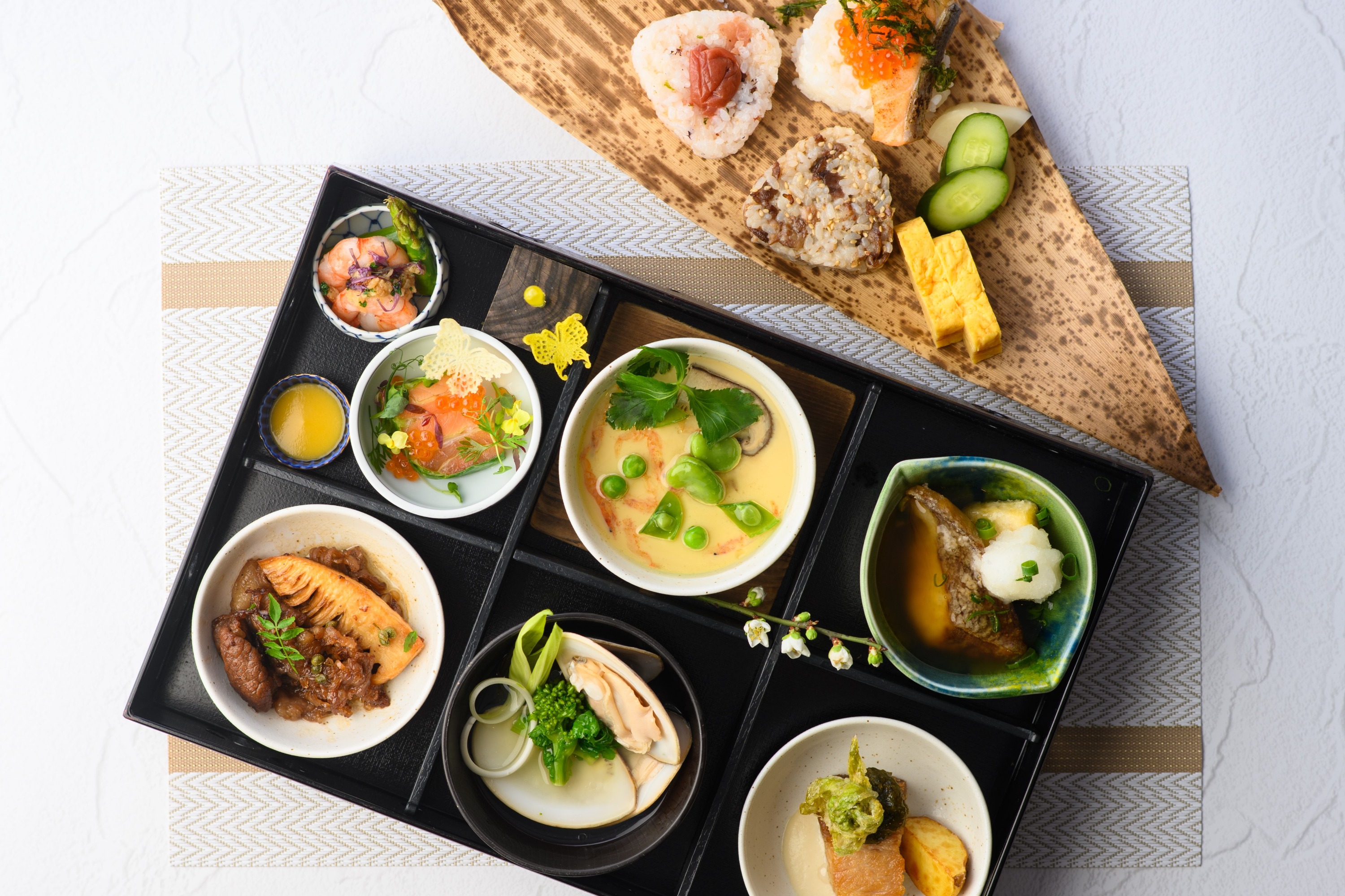 我们提供三种用老式竹皮包裹的饭团,以及装满Ishikawa奢华春季食材如能登牛和能托猪肉的便当盒。
