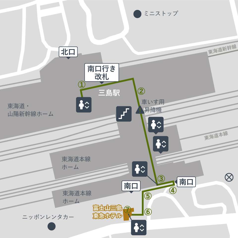 按照指示标志沿路前进,下楼梯。有轮椅用的升降机,请向三岛站站务员申请。