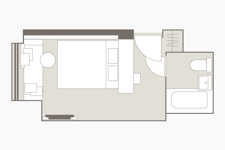 位于朝西的角落,设有宽敞的 160 厘米大床和沙发。