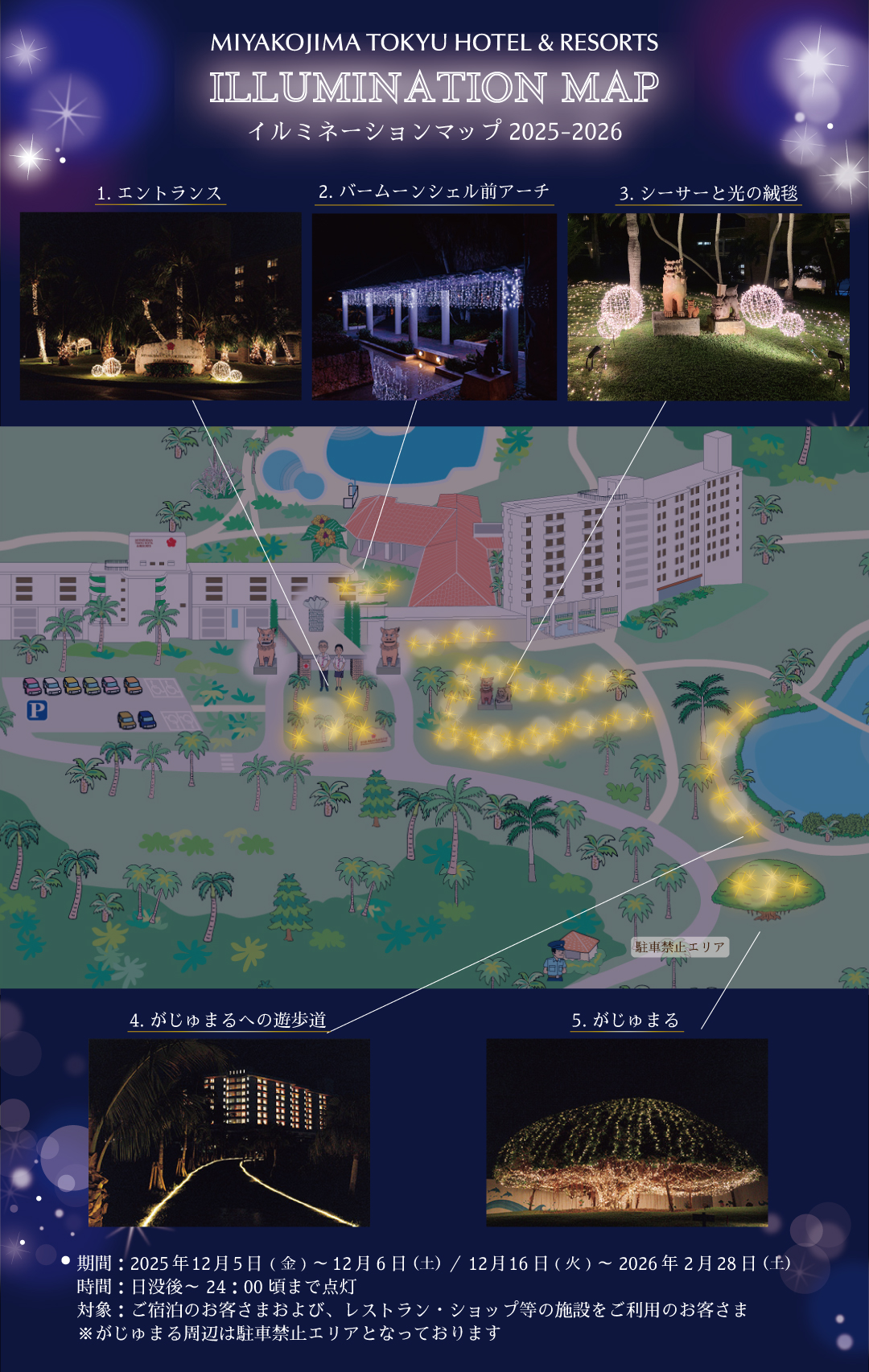 今年我们还会再次举办灯光活动!MIYAKOJIMA TOKYU HOTEL & RESORTS请在夜晚散步时享用冬季特色“加十丸照明”和新加入的“光之地毯”。 请参见下方“照明地图”中的照明位置。