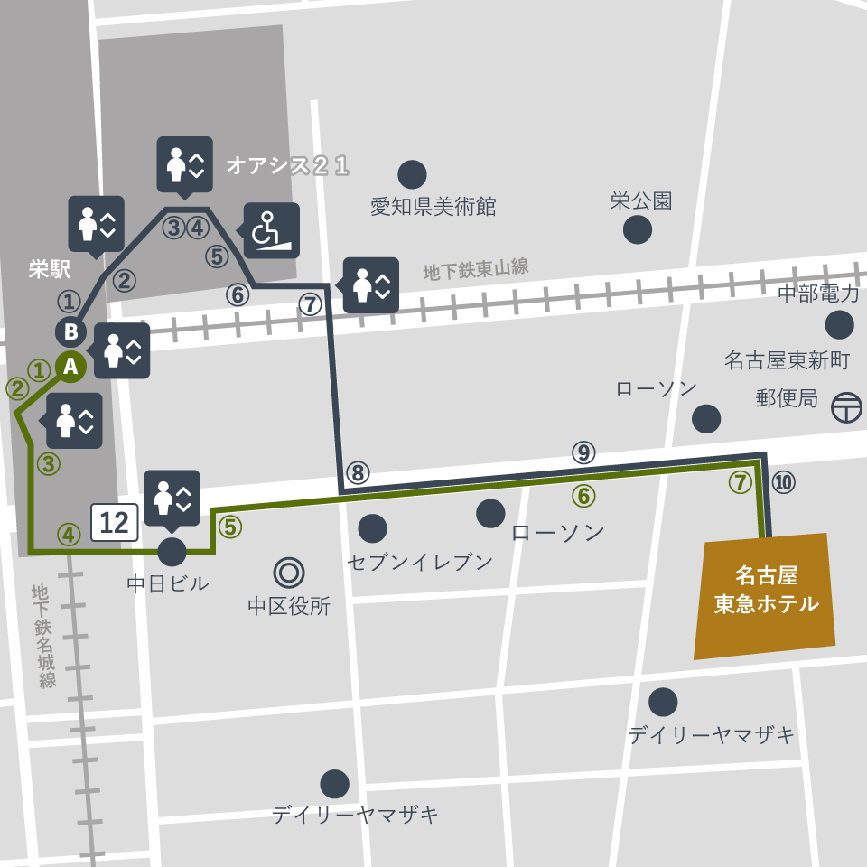 A(推奨ルート)は中日ビルの閉館時間(深夜24:00~翌5:15)は御利用いただけません。