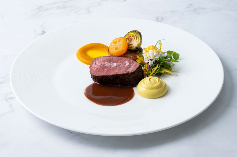 日本产牛里脊肉的烤肉串和肉酱配红酒酱汁