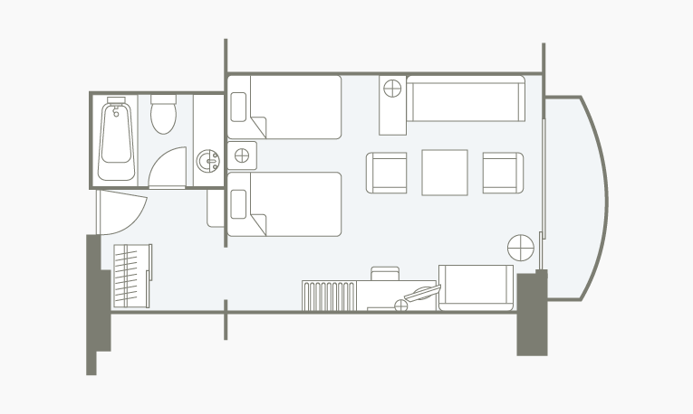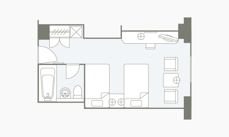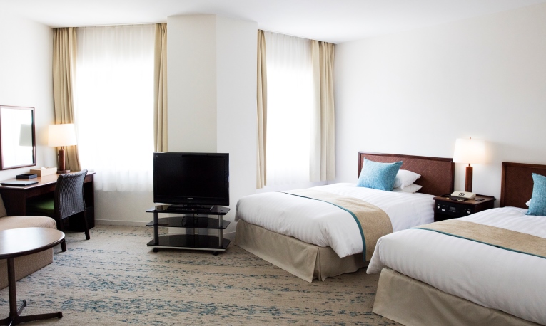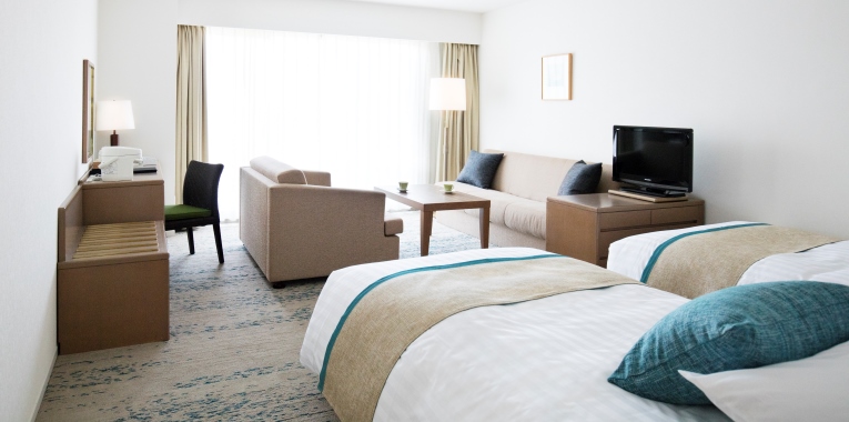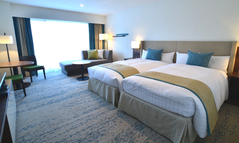适合海边假日的明亮室内装饰。请从重视景致的海景双人间,重视面积的带阳台的双人间中选择。