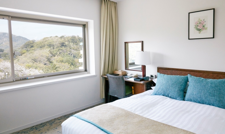 大开的窗外,布满了坚果蓝!请在宽敞房间布局的豪华客房中,欣赏大浦湾的绝景。