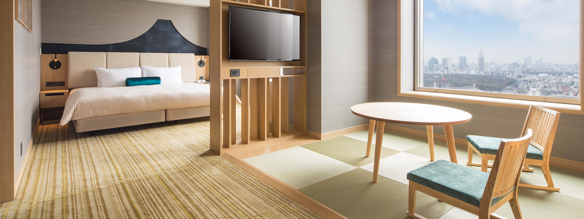 在維持西式房間的功能性和易用性的同時,讓人感受到“日本風格”的套房。在床板的設計中,採用了與房間名稱聯動的“富士山”作為主題。採用讓您踏入房間的瞬間就能感受到“日本雄偉的景色”的牆面裝飾。室內中央新設了木制格子狀牆壁,將臥室和客廳分開,使整個客房呈現出立體感。客廳區域是“榻榻米地板+日式椅子・桌子”的組合,在客廳也可以輕松度過。請一邊悠閒地坐著一邊享受眺望東京的樂趣。