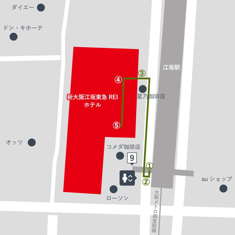 從江坂站南檢票口出站後,請沿右手邊前進。