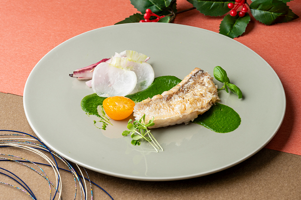 烤甘鯛的鱗片春菊和羅勒調味汁