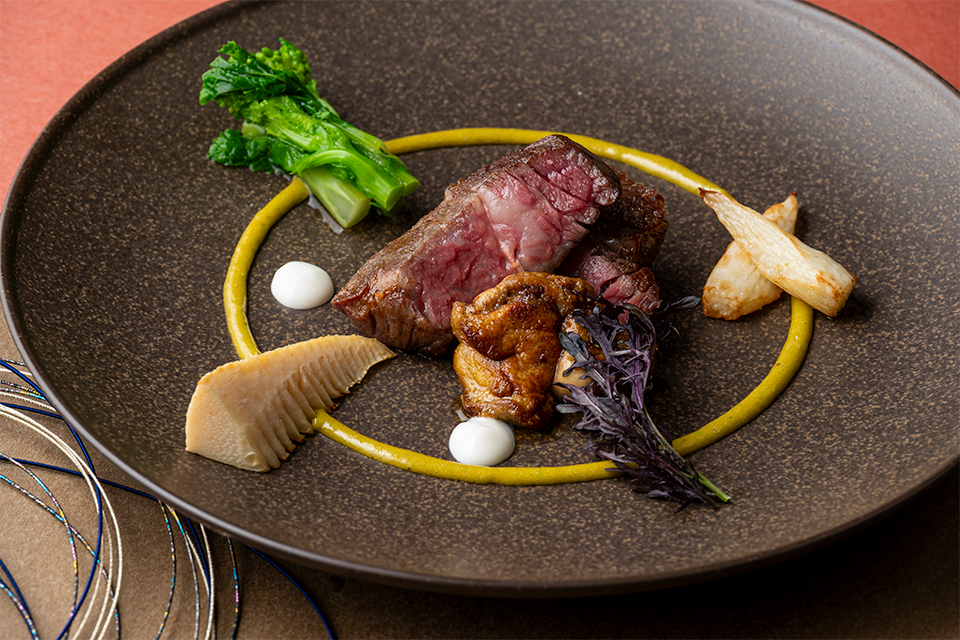國產牛內腿肉的低溫調理芥末醬汁和醬油慕斯