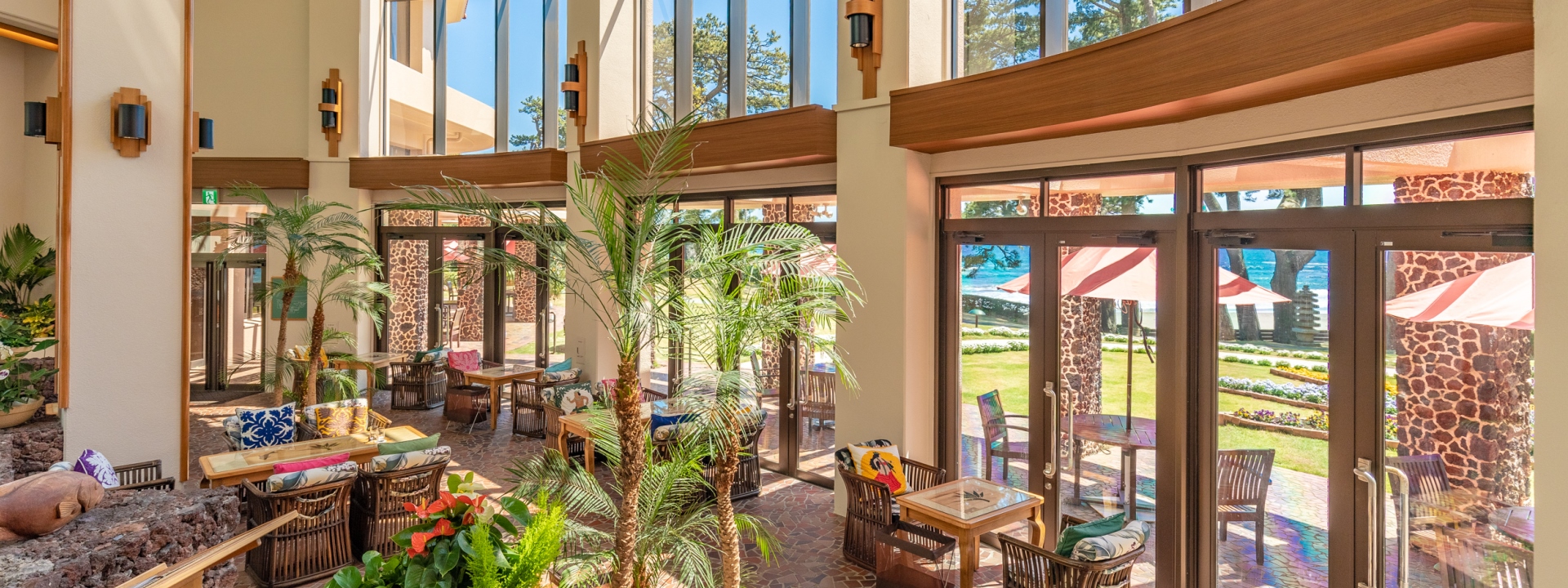 天然石砌成的牆面裝飾和大理石的桌子讓人聯想到南國的酒吧休息室。請享受與調酒師的對話以及在度假酒店的優雅時光。