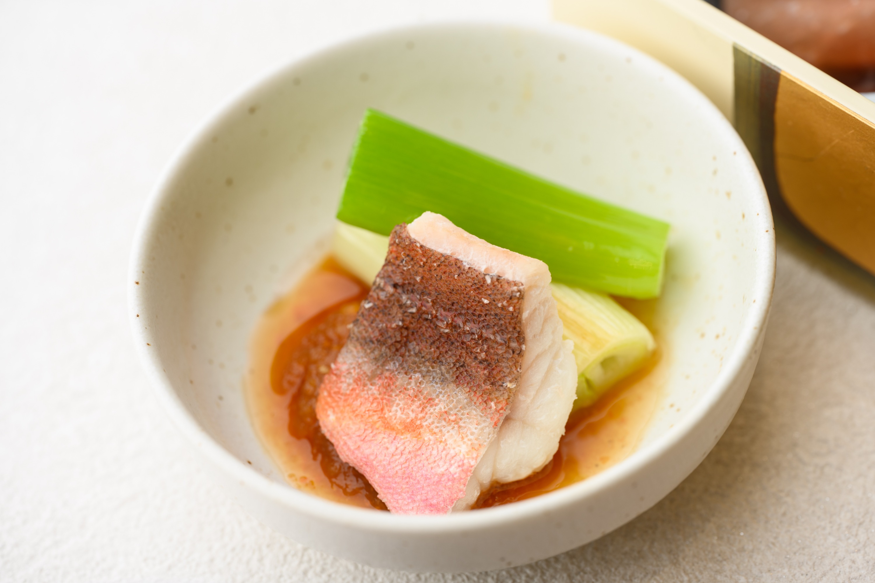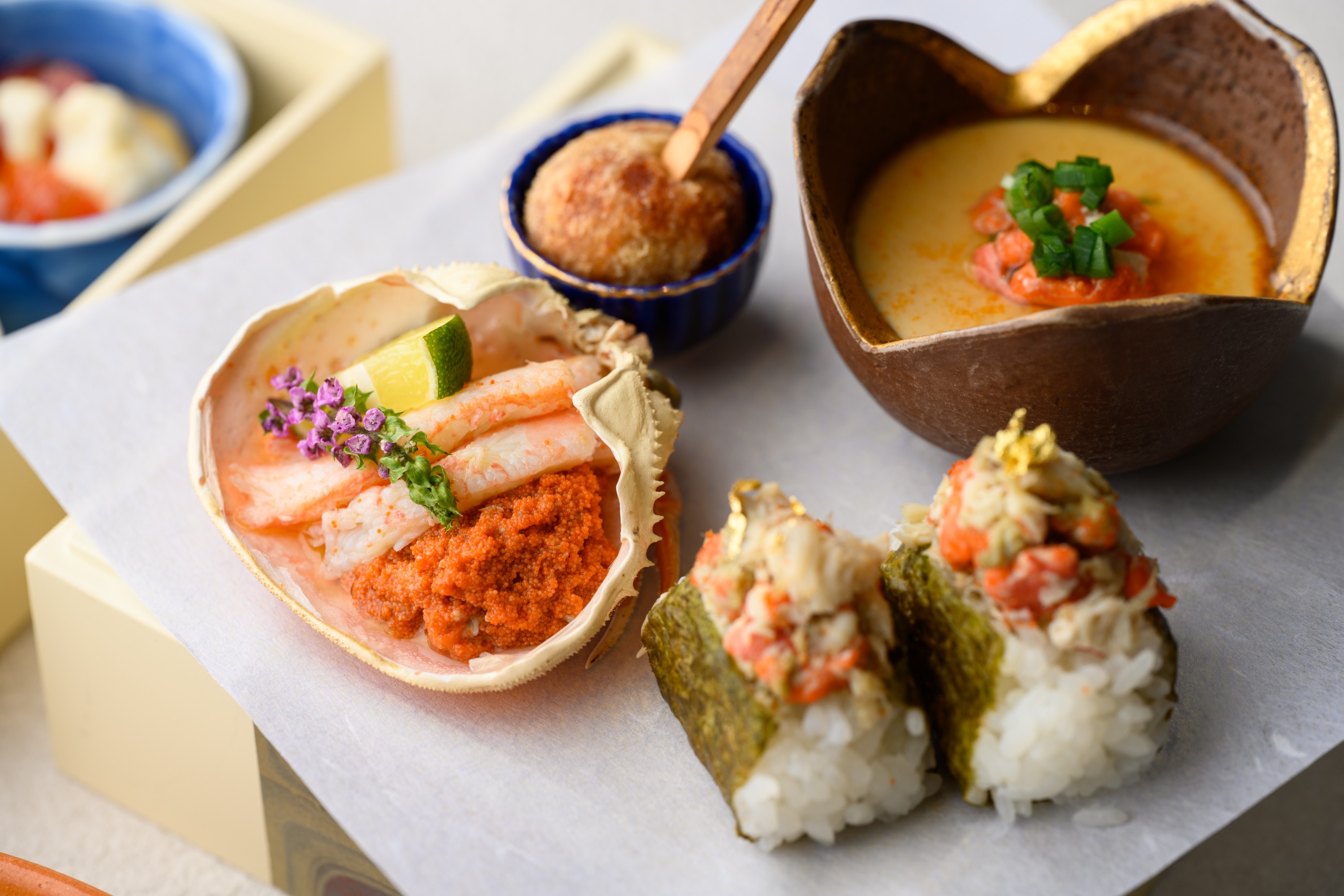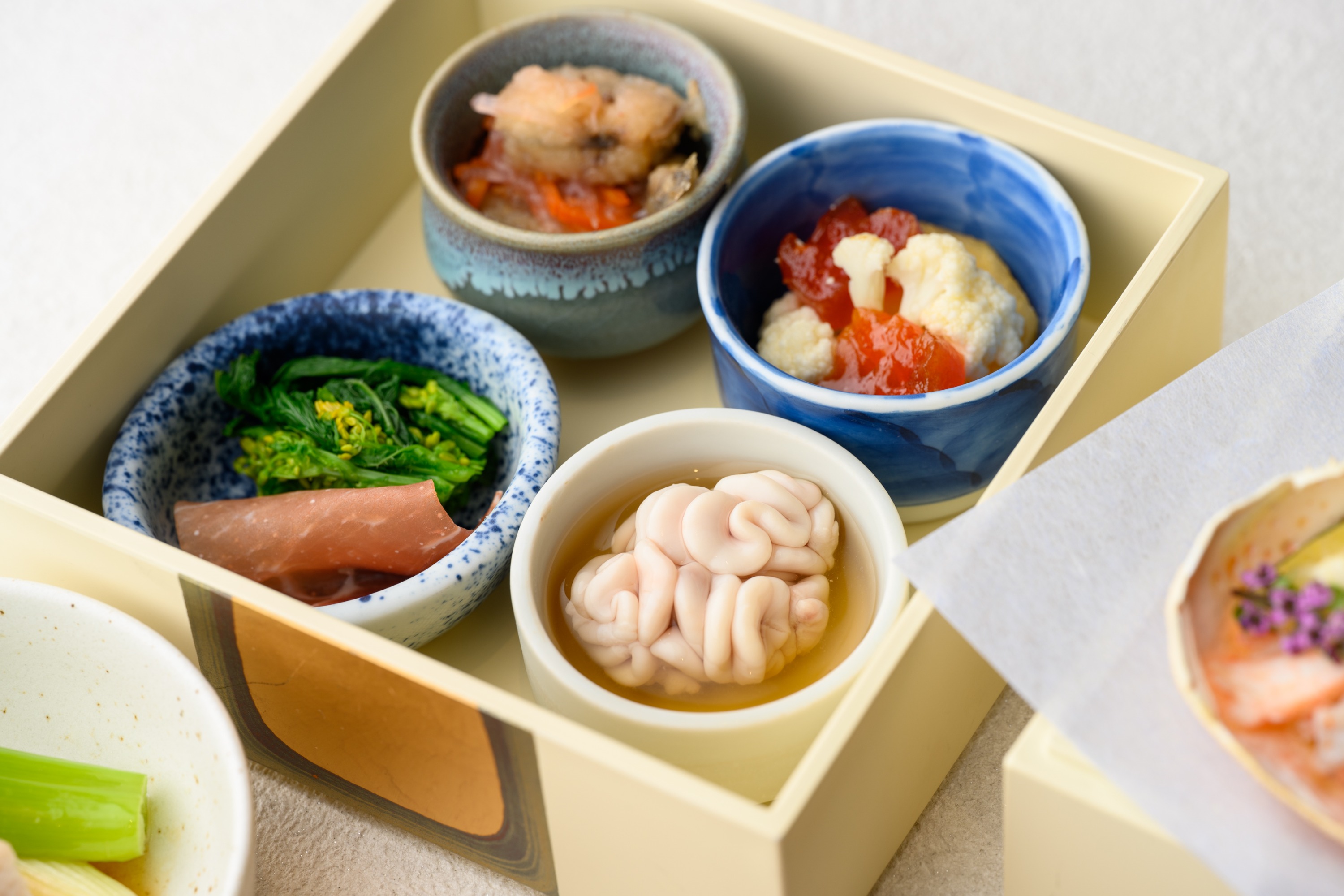 以貼有古代箔的三層重為容器,備有能登牛、近江町市場的時令鮮魚、當地蔬菜等。