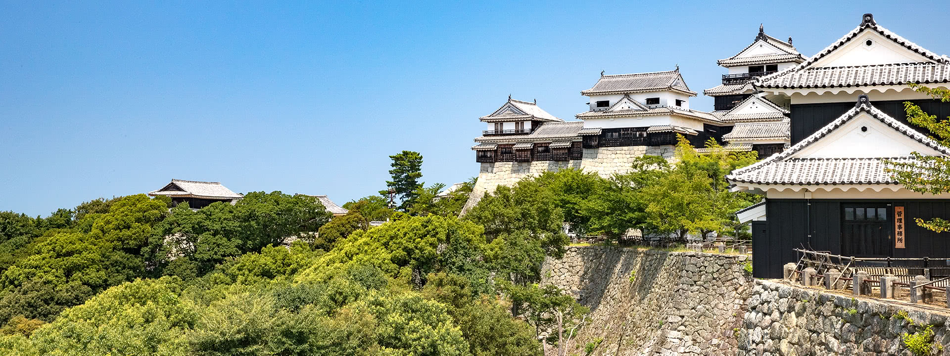 位於松山的中心勝山的日本三大聯立式平山城的松山城。有很多建築物被指定為國家重要文化財產,春天是賞櫻的名勝。山腳下也有幽靜的二之丸史跡庭園。