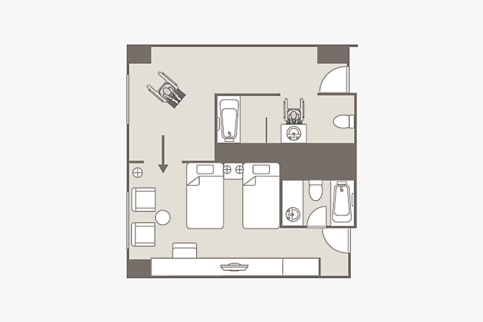 房間的佈局只是一個例子。面積和家具的配置、備品等根據房間而不同,請事先了解。