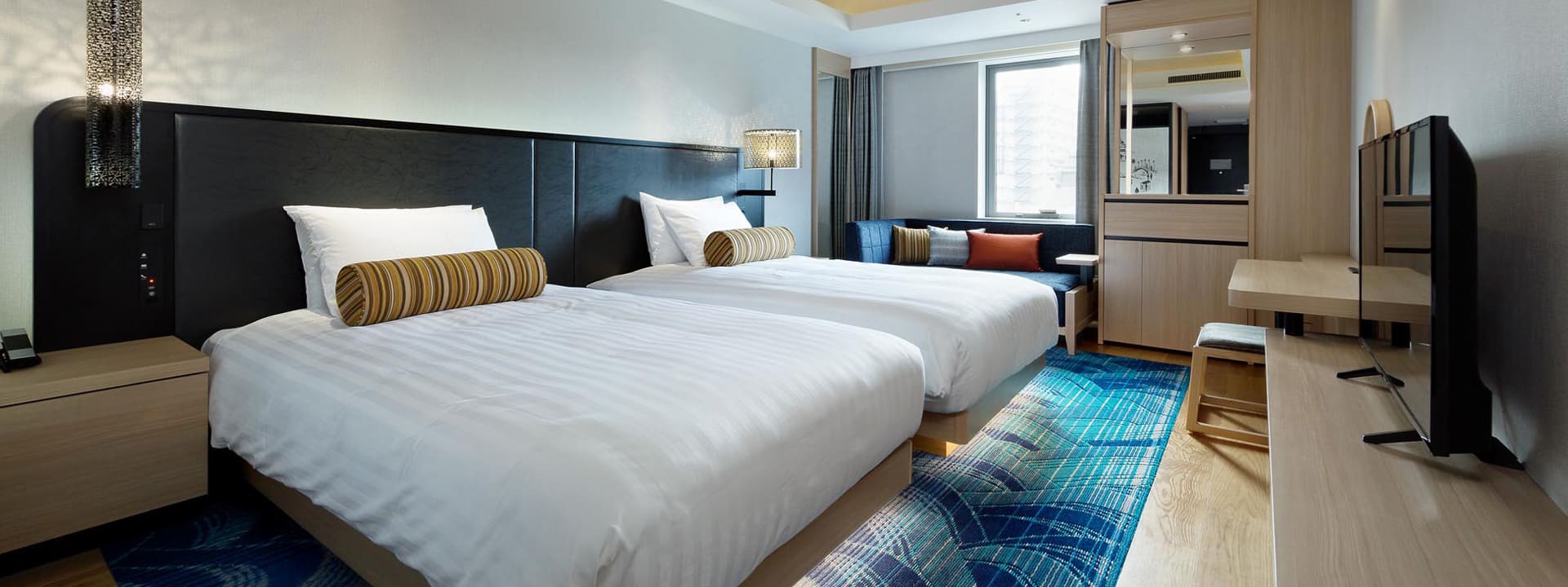 可以脫鞋光腳度過的日式雙人房。腳下大膽地點綴著作為難波 (浪花) 的語源的大阪灣波浪。