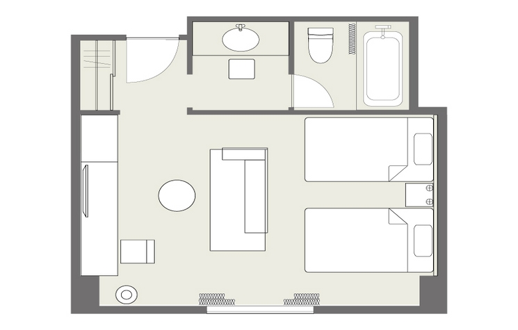 房間的佈局只是一個例子。面積和家具的配置、備品等根據房間而不同,請事先了解。