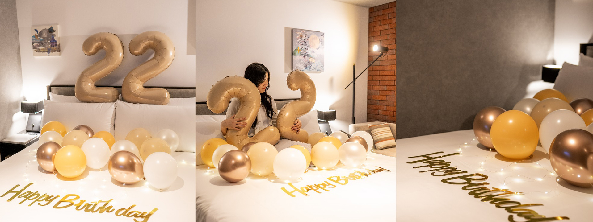 進入房間的那一刻,一個巨大的數字氣球進入了我的眼睛。床上的周年紀唸橫幅是為了祝福特別的日子的一句話。夢幻般的空間遍佈整個房間。可作為與家人、朋友、伴侶的最美好回憶。