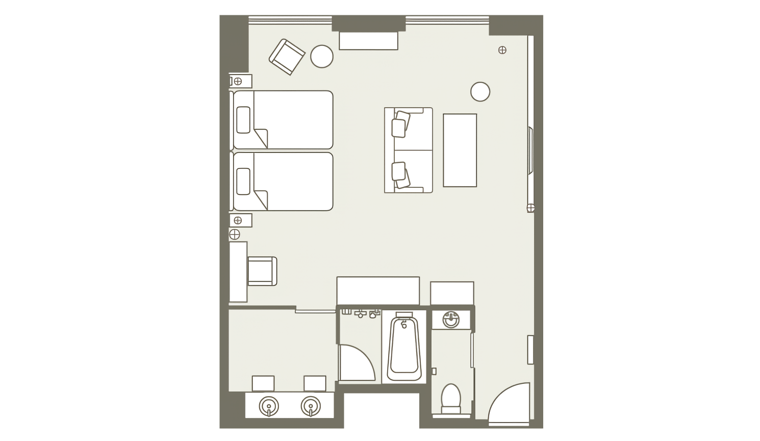 房間的佈局只是一個例子。面積和家具的配置、備品等根據房間而不同,請事先了解。