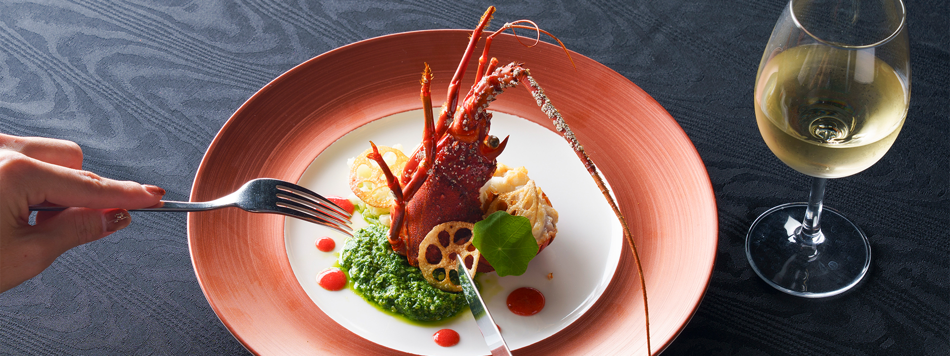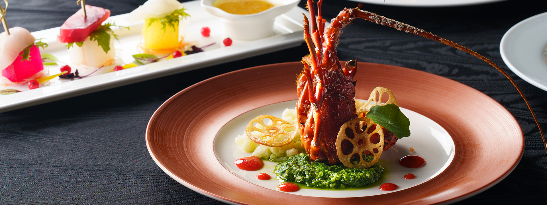 主菜的魚料理“烤伊豆產伊勢蝦”,可選用伊豆產伊勢蝦搭配伊豆產金目鯛。