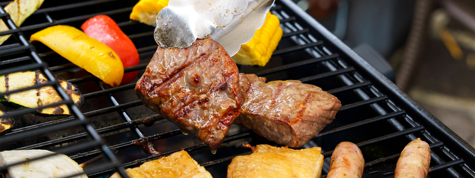 牛ロース肉、低温調理した鶏モモ肉、豚骨付きスペアリブ、ソーセージ
