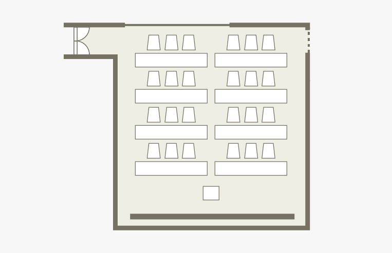 學校形式的會議室最多可供24人使用,就座的宴會形式以及立式自助餐形式最多可供40人使用。